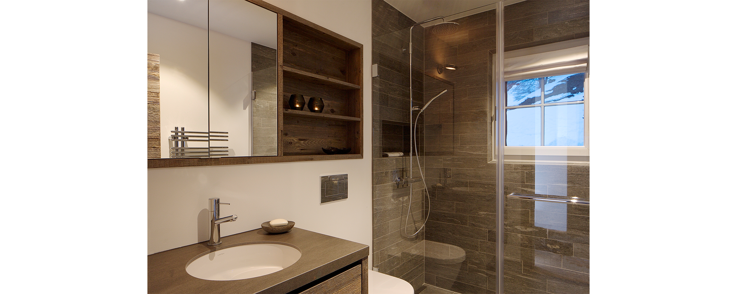 Wer es gerne ein bisschen rustikaler hat, der verwendet im Bad Altholz. In diesem Bad wurde eine Kombination von Altholz und einer Keramikabdeckung gewählt. In die Nischentablare wurde eine LED Beleuchtung eingelassen und das Möbel unter dem Waschbecken wird indirekt beleuchtet für eine gemütliche Atmosphäre. Man achte auf die Rückwand: Dies sind Platten, kein Naturstein. Die Optik ist aber sehr ähnlich. Dieses Bad befindet sich in der mittleren Preisklasse.